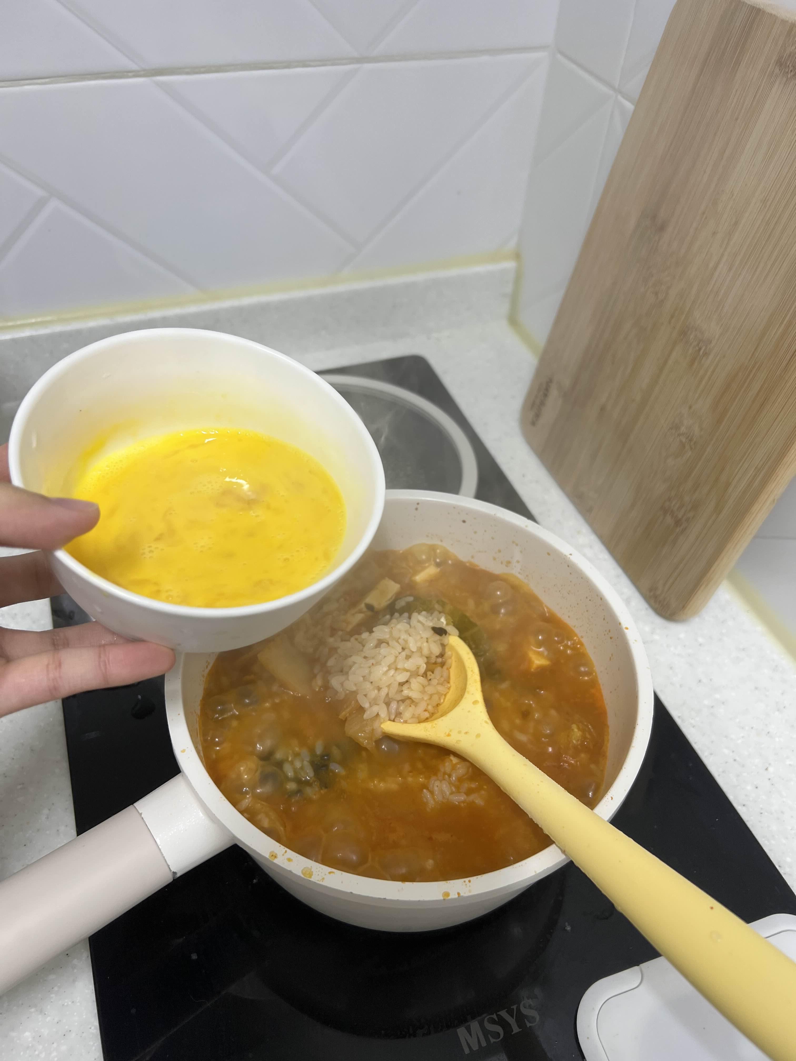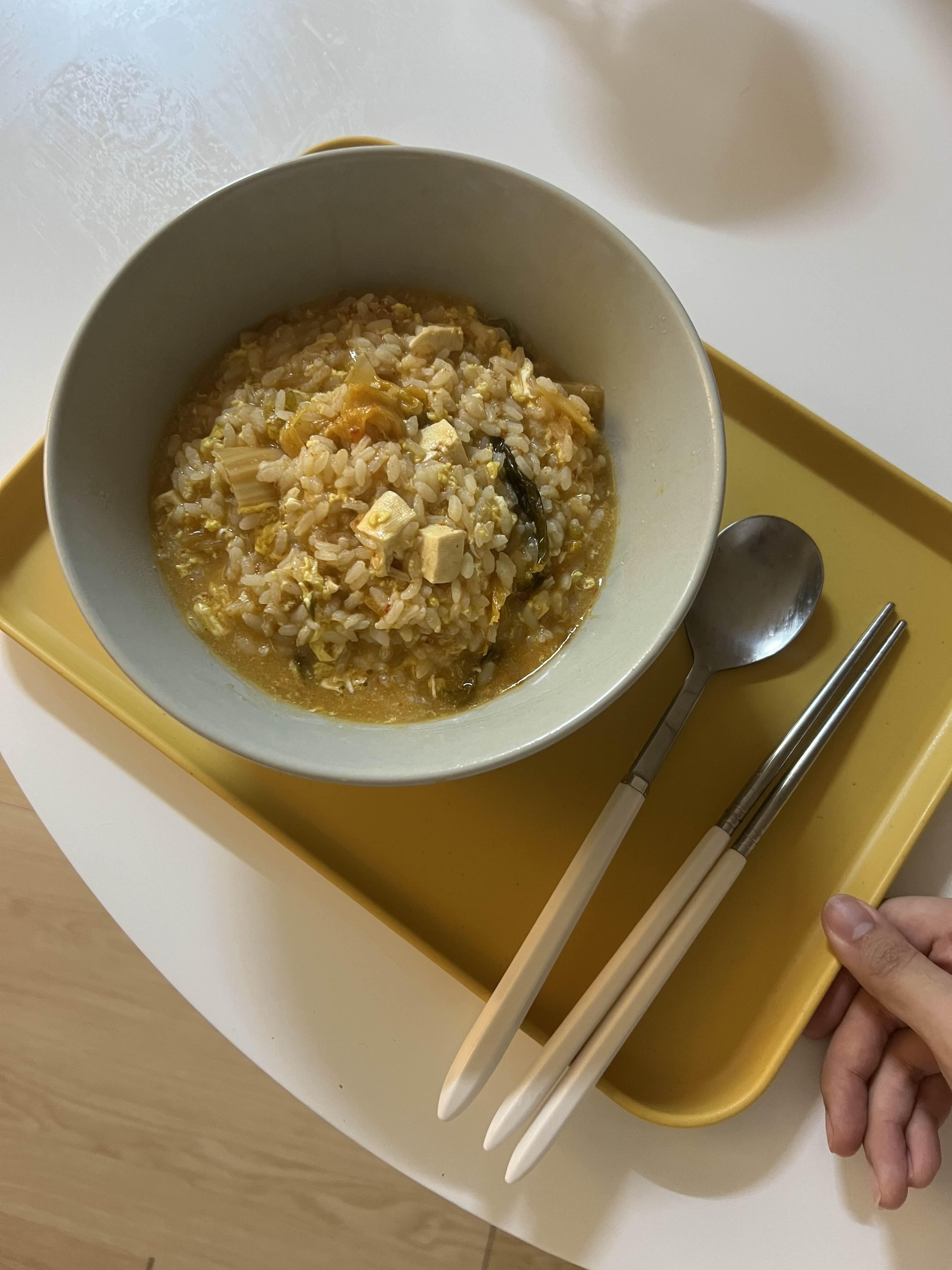 연한 김치찌게에 보들해진 밥알에 계란이 있어 부드러운 맛이랄까요?