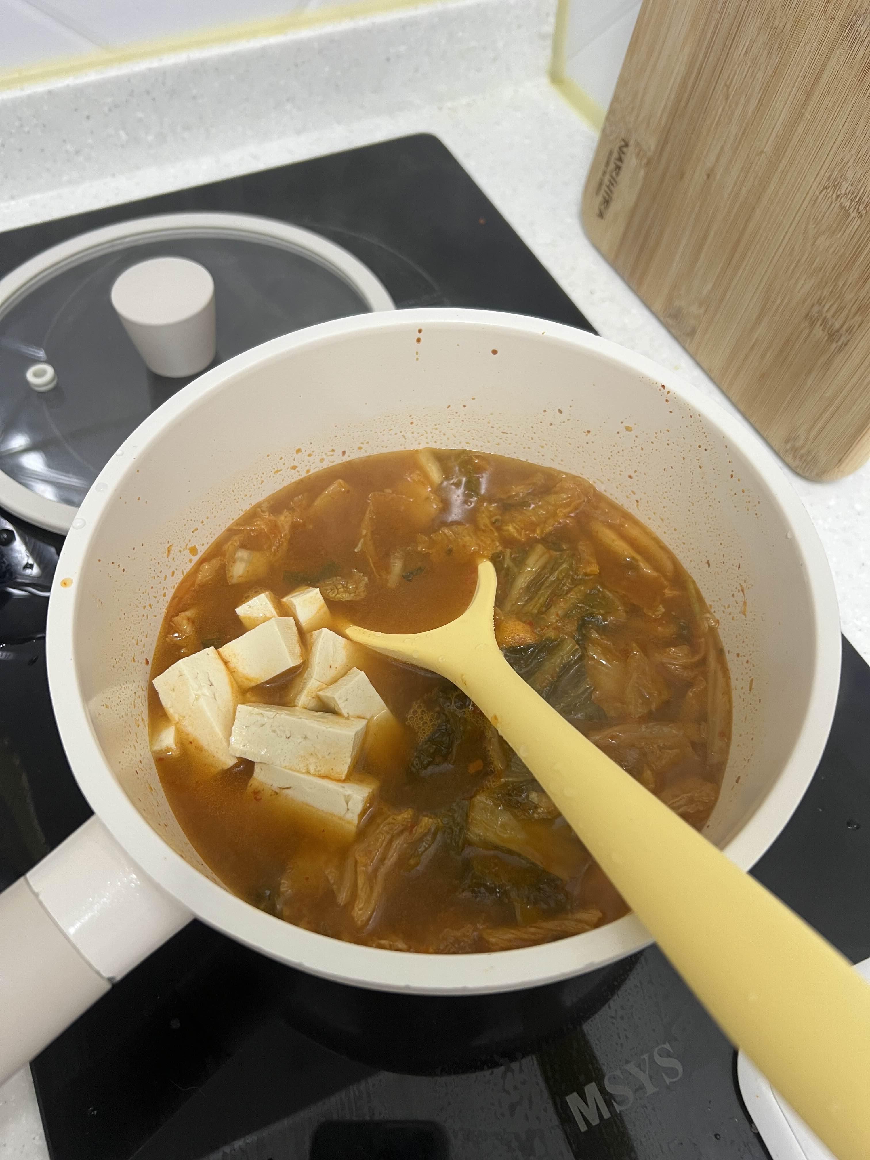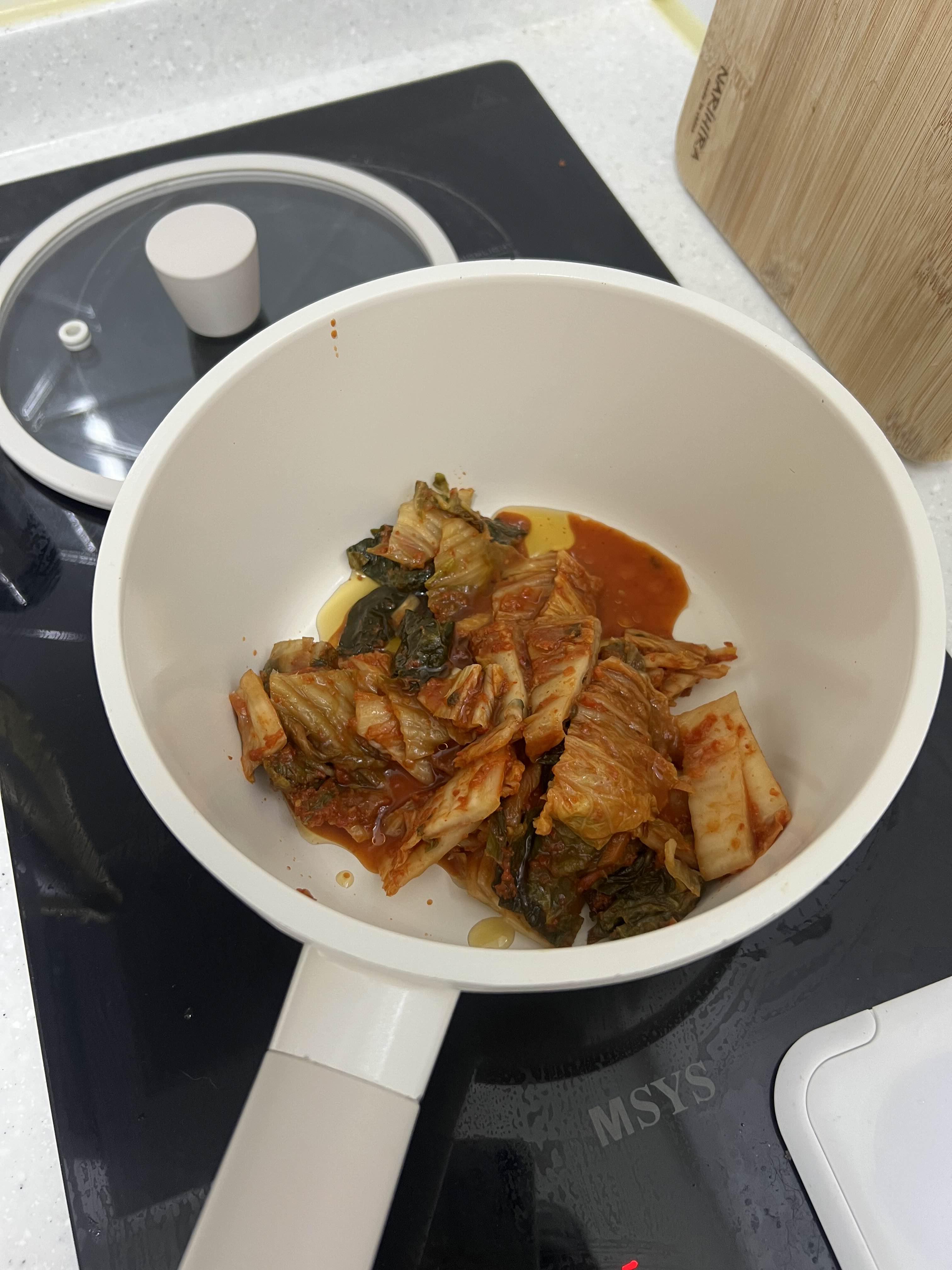 먼저 냄비에 들기름을 두르고 김치와 김치국물을 넣고 볶아줍니다.