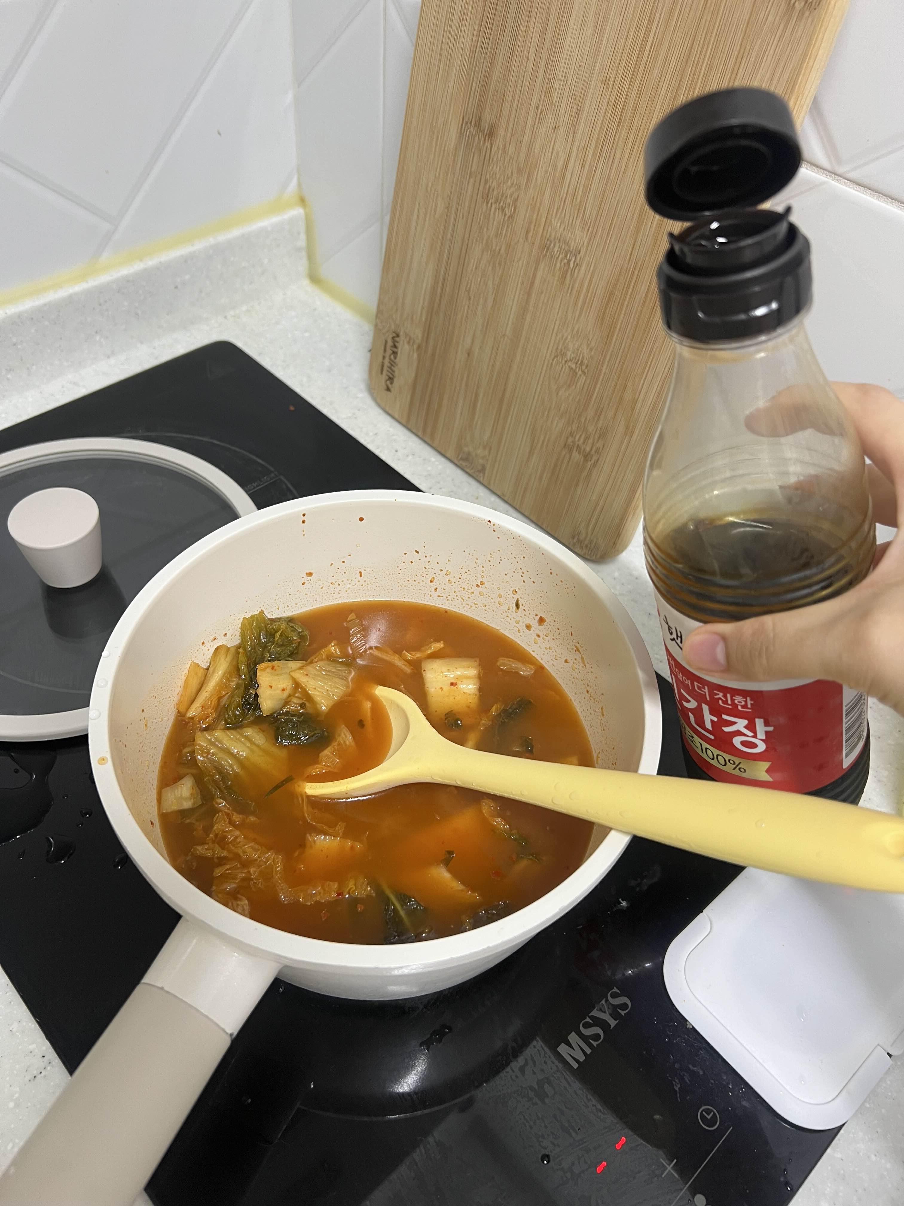 이후 물을 붓고 간장 한숟가락 넣어 간해줍니다.