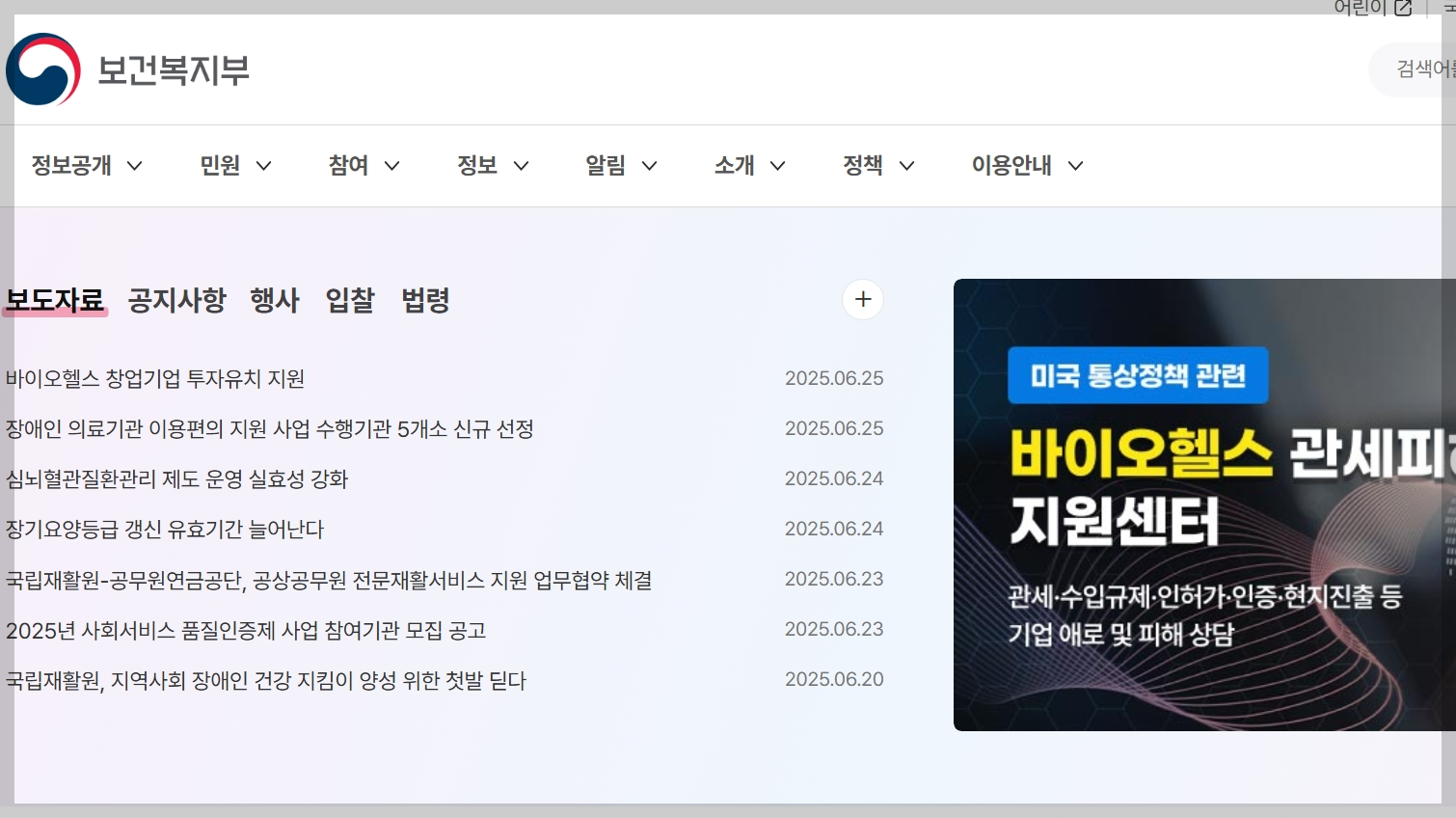 모든 국민의 건강, 삶의 질 향상을 위해 노력하는 보건복지부 홈페이지입니다.