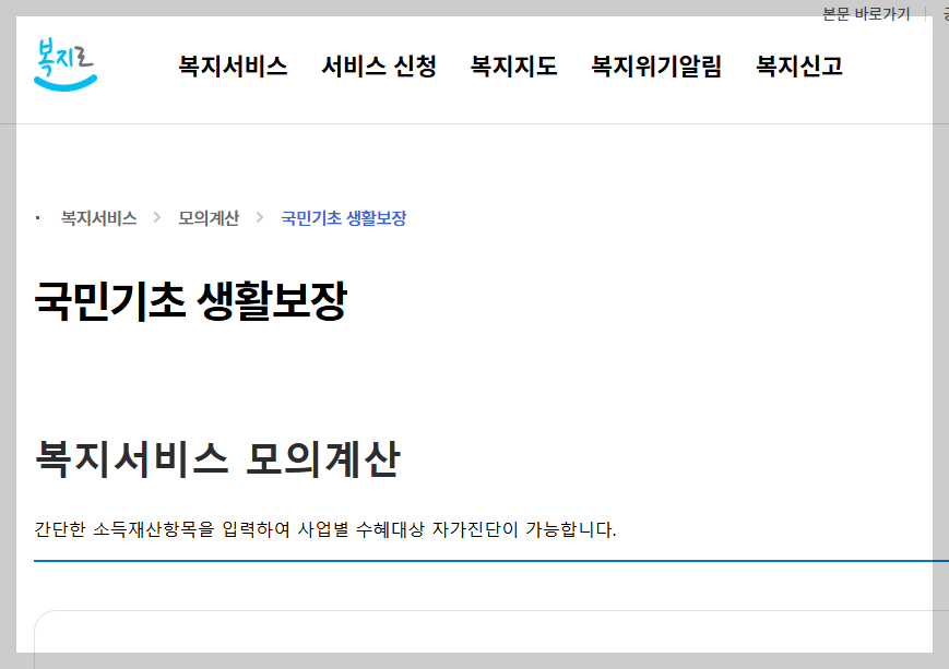 아래 이미지를 클릭하시면 국민기초생활보장 모의계산 사이트로 연결됩니다.