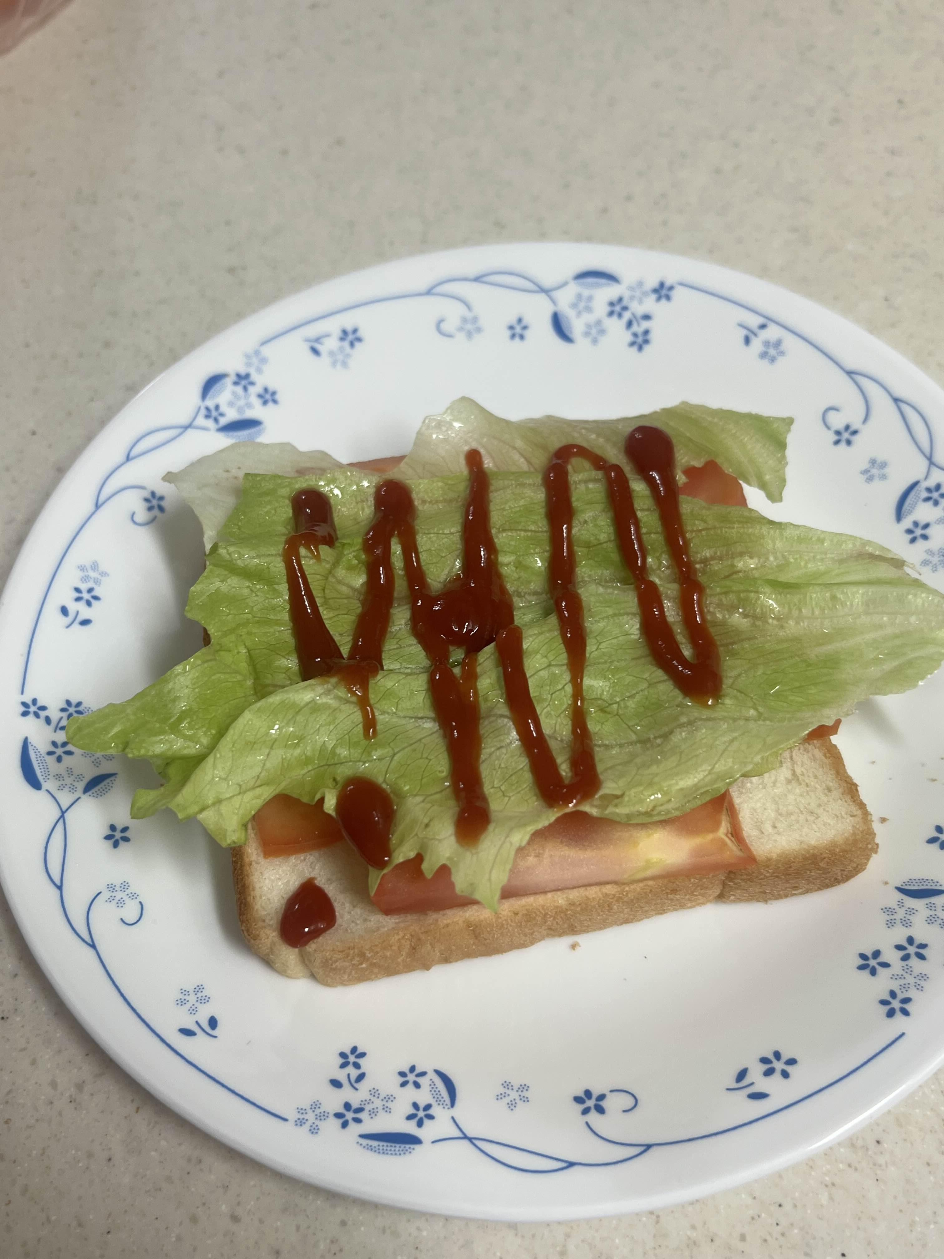 샌드위치빵 위에 토마토 양상추 올리고 케첩 뿌려줘요