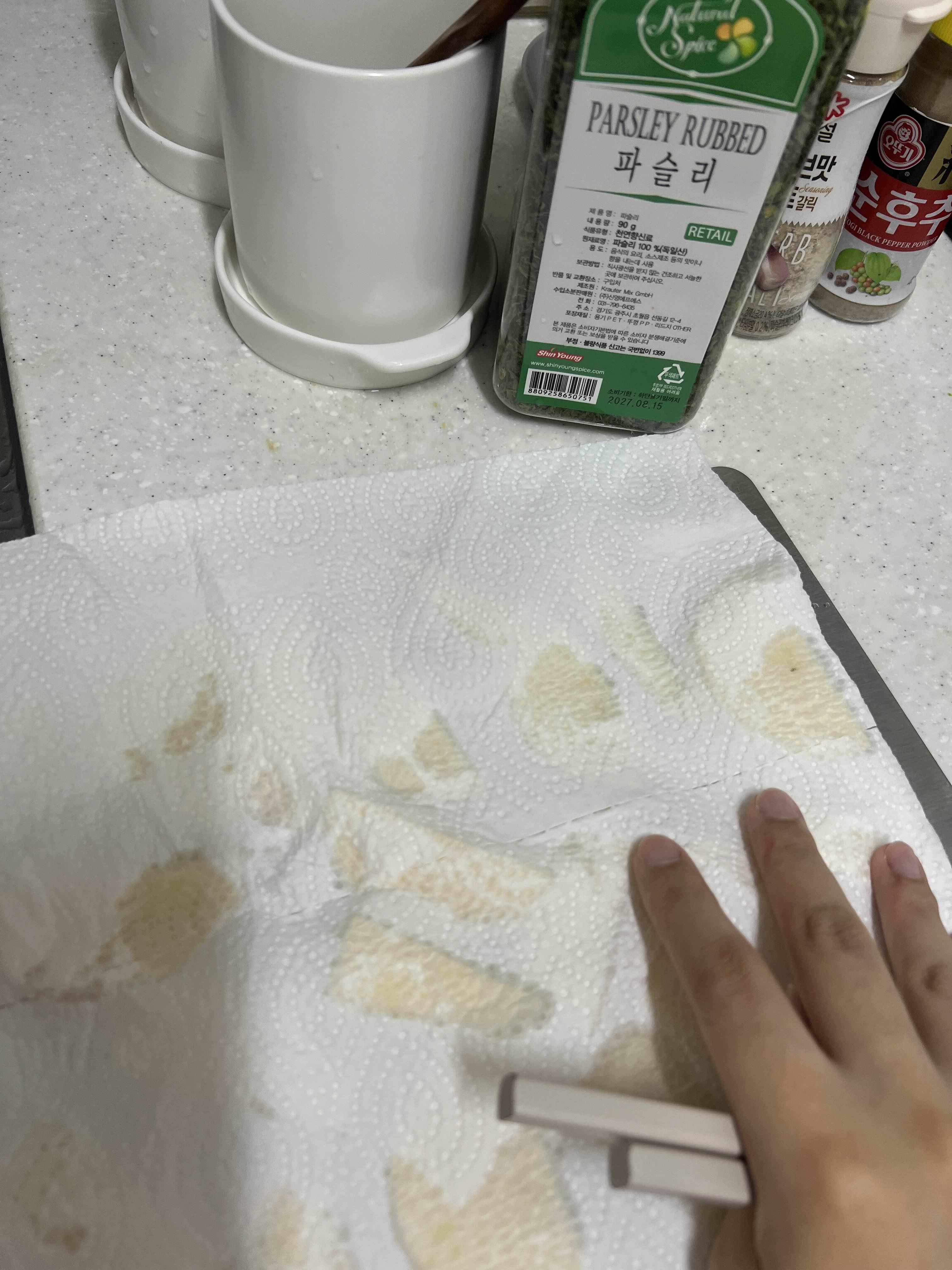 감자, 마늘, 소금, 후추, 파슬리, 버터, 키친타올
