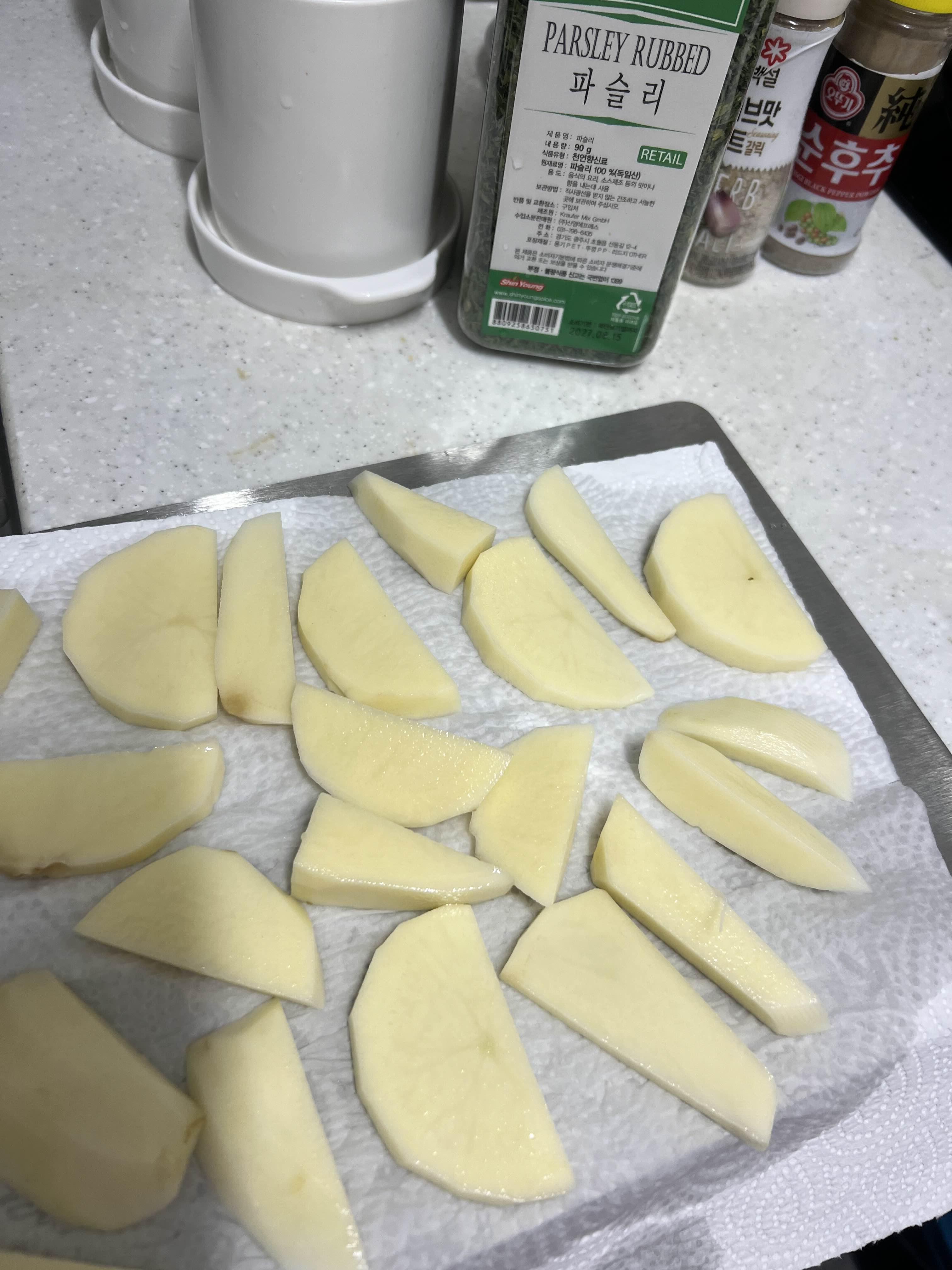 전분제거후 감자는 키친타올을 이용하여 물기를 제거해줍니다.