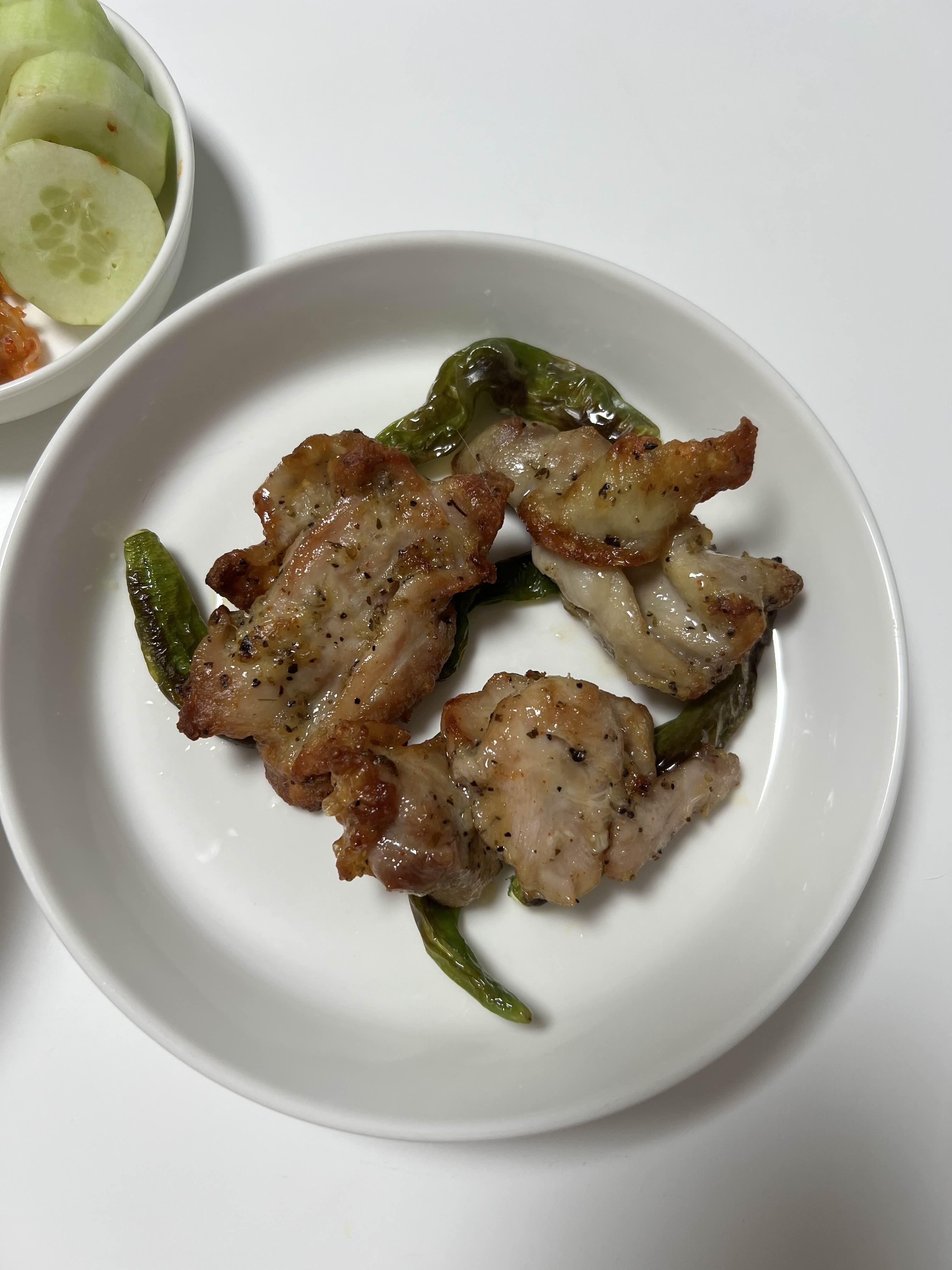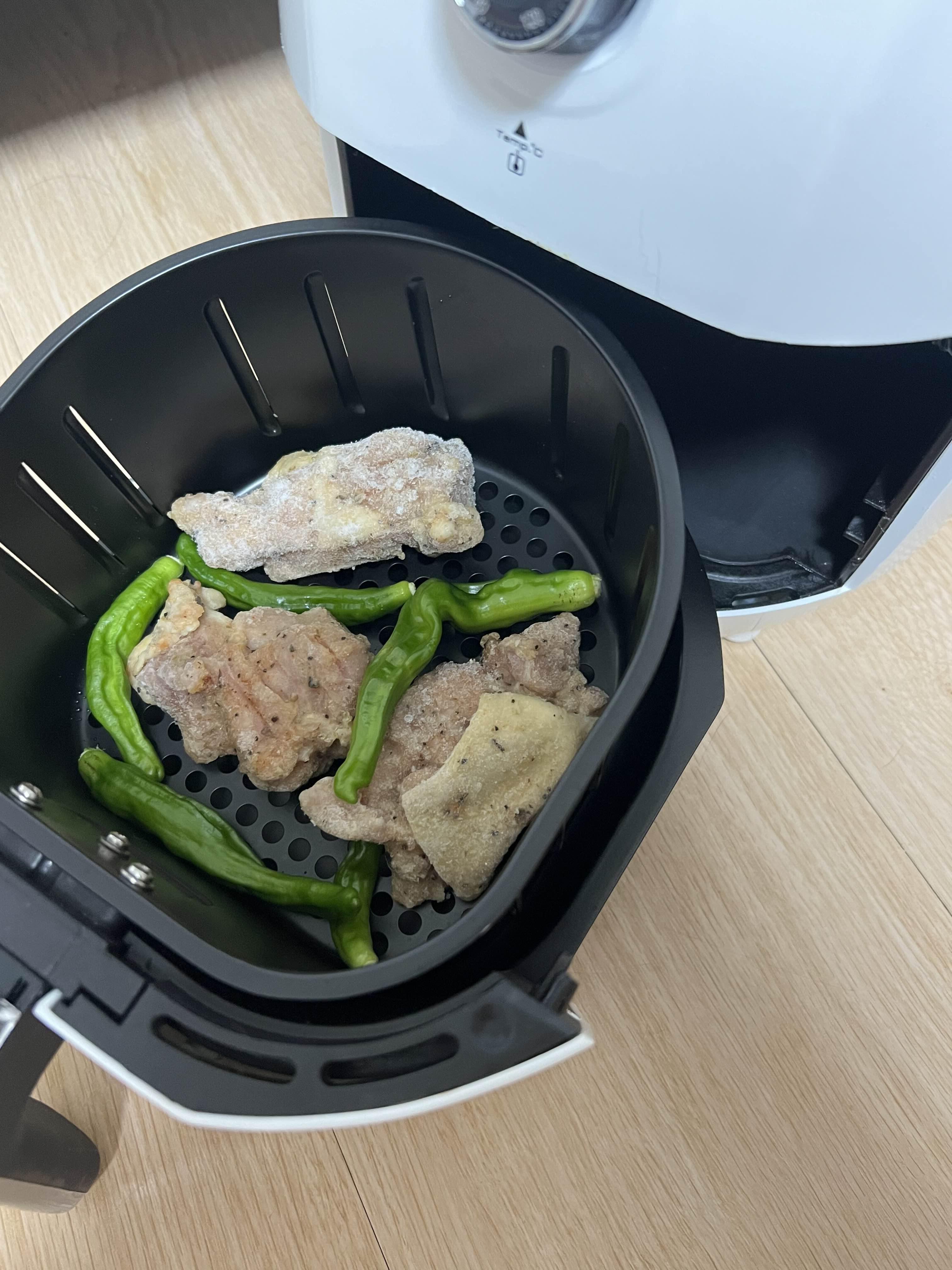 구이용닭다리살(냉동), 꽈리고추, 에어프라이어, 종이호일