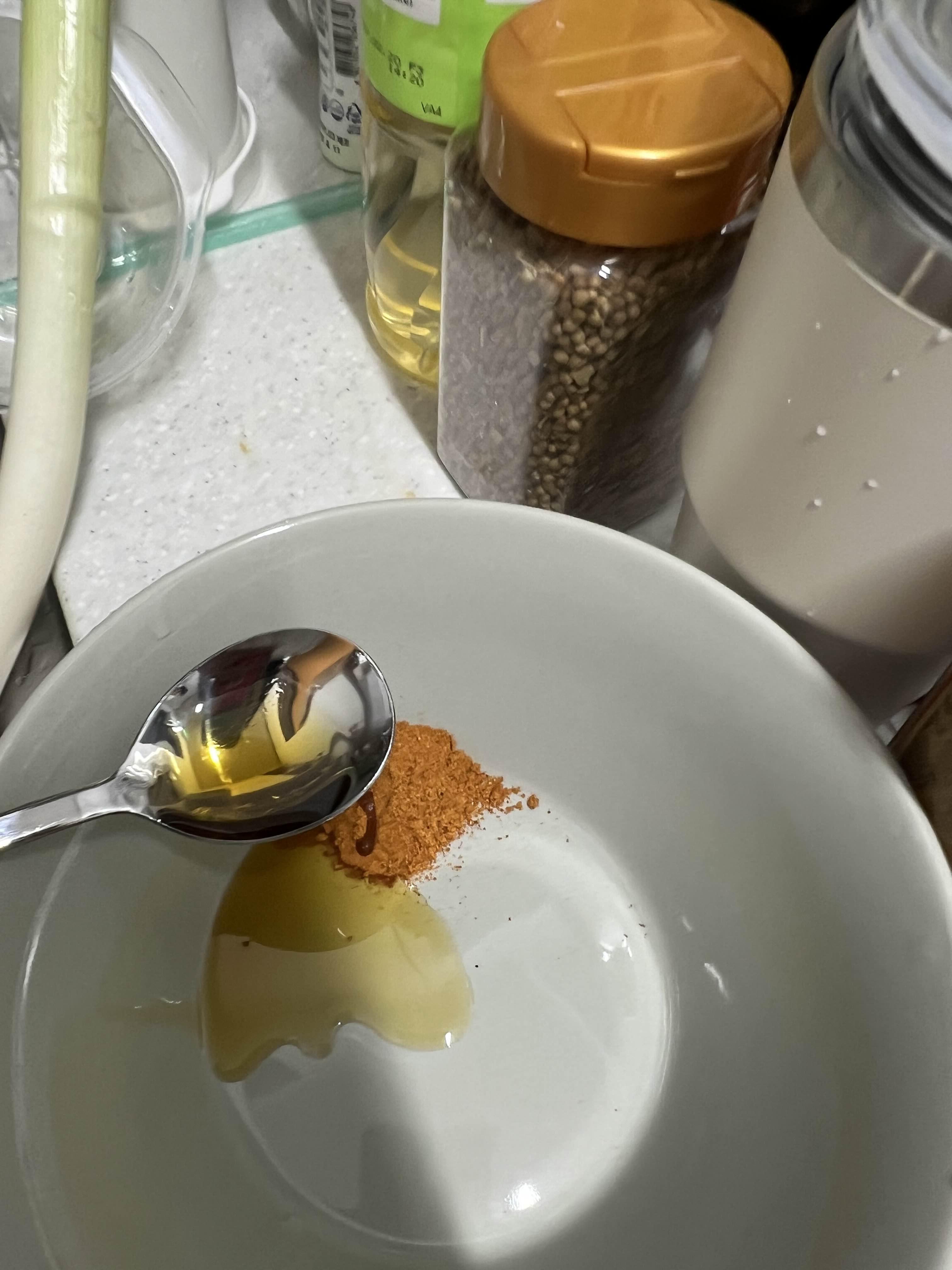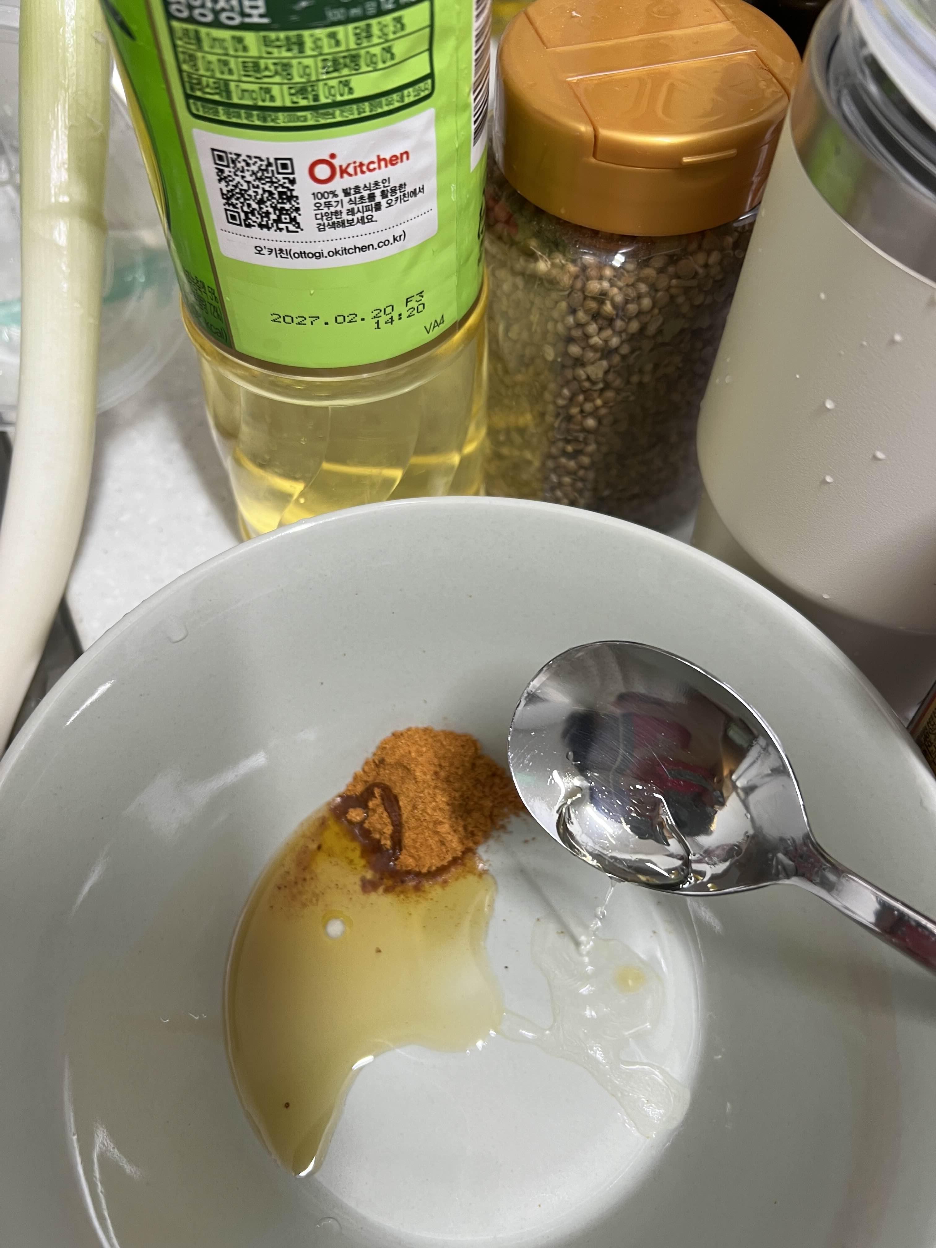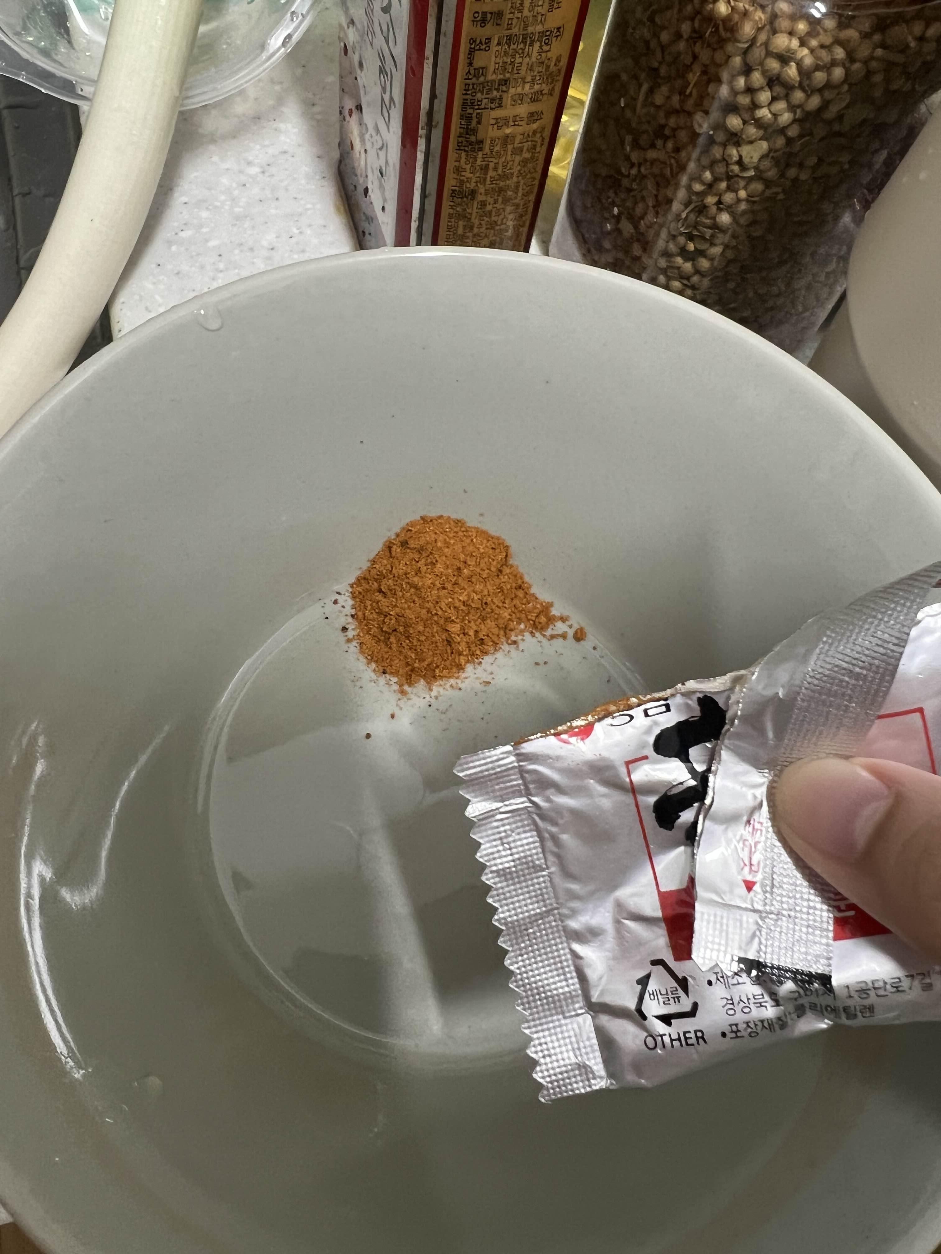 신라면1봉지, 식초1/2, 참기름1, 알룰로스1/2, 간장1/2 (계랑 숟가락), 대파, 김가루