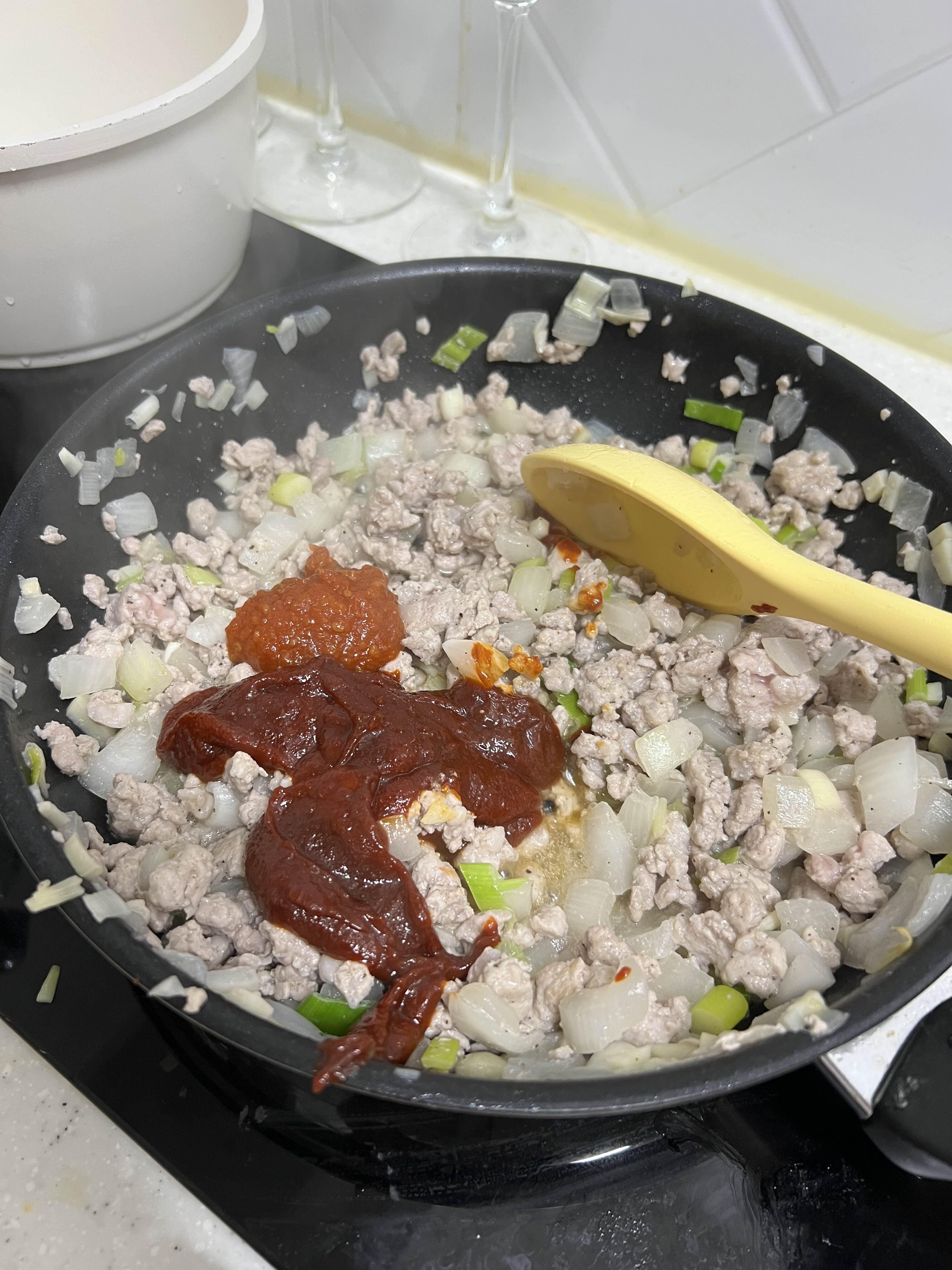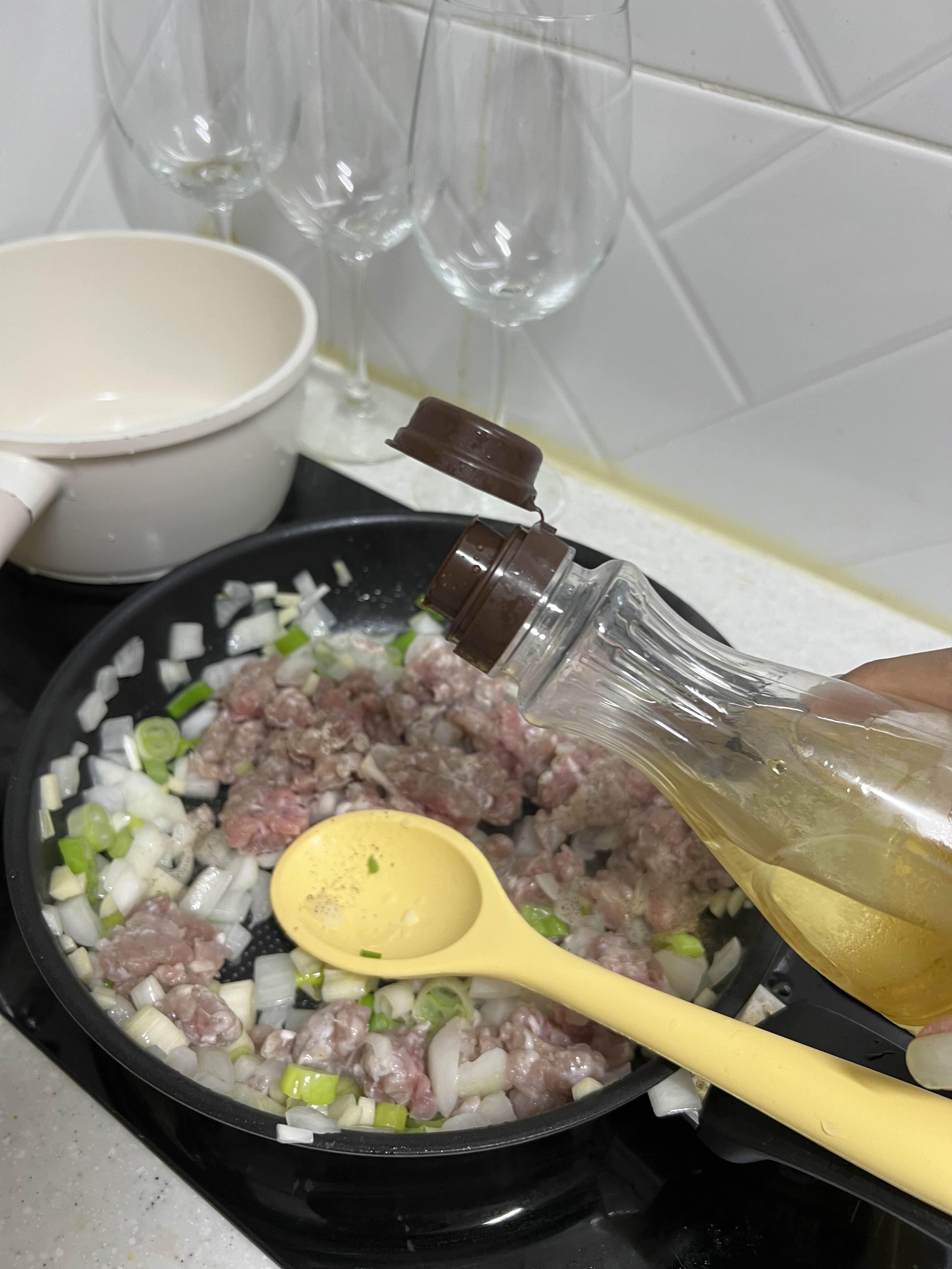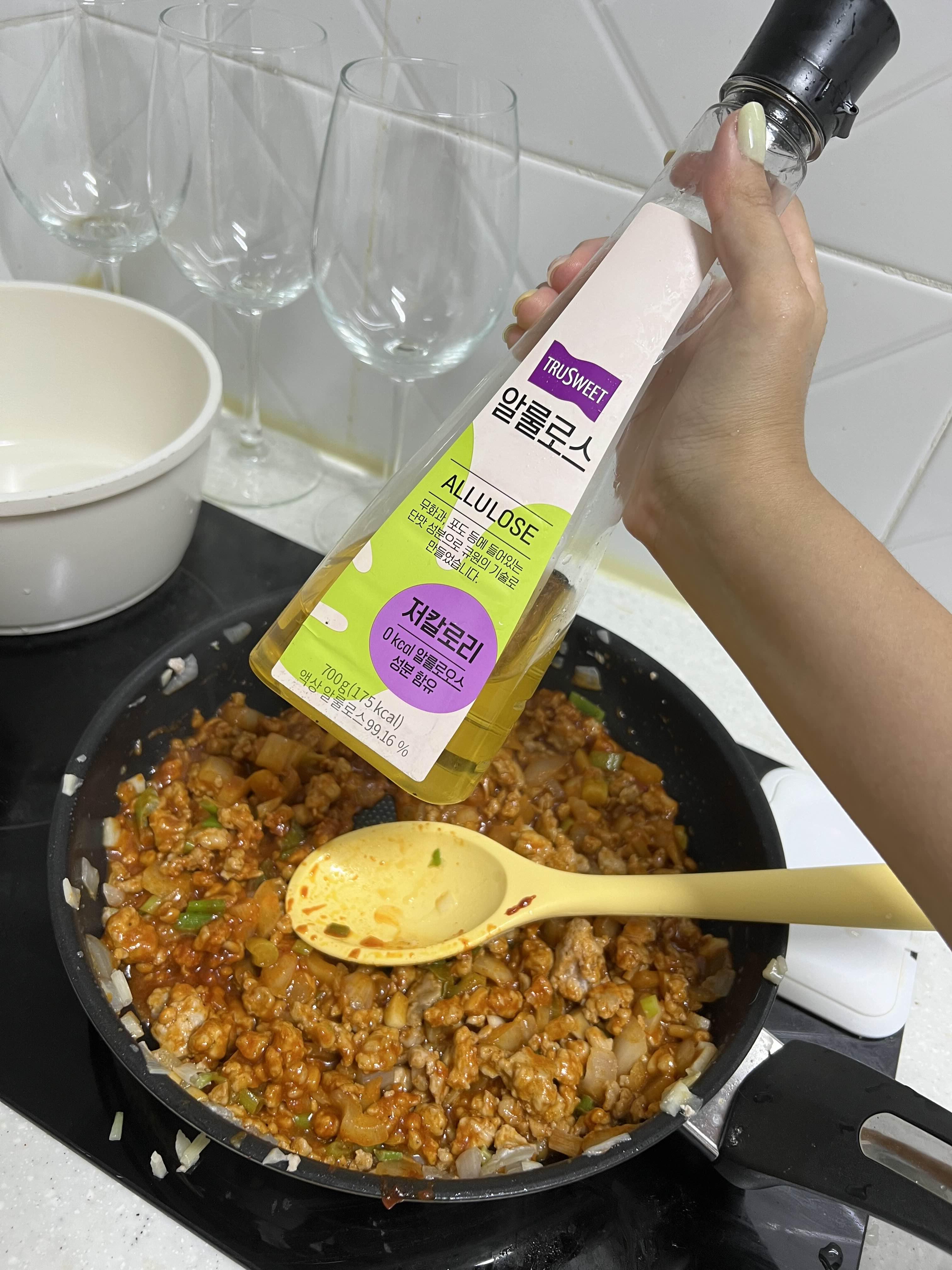 다짐육 200g, 미림(혹은 맛술), 고추장, 된장(쌈장), 알룰로스(설탕대신), 양파 반개, 파 한대, 다진마늘1개, 식용유