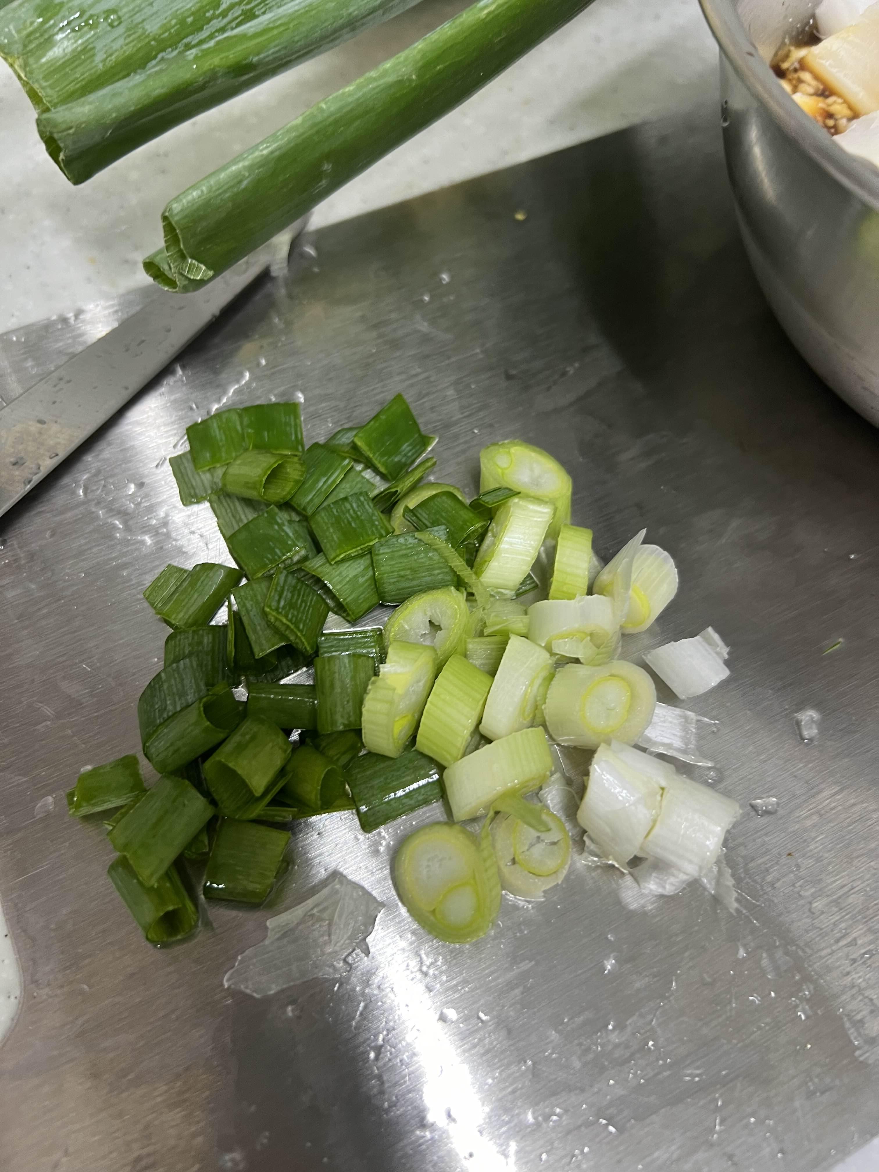 양파 1/3 가량 잘게 썰어주고, 대파 1/4가량 썰어주고