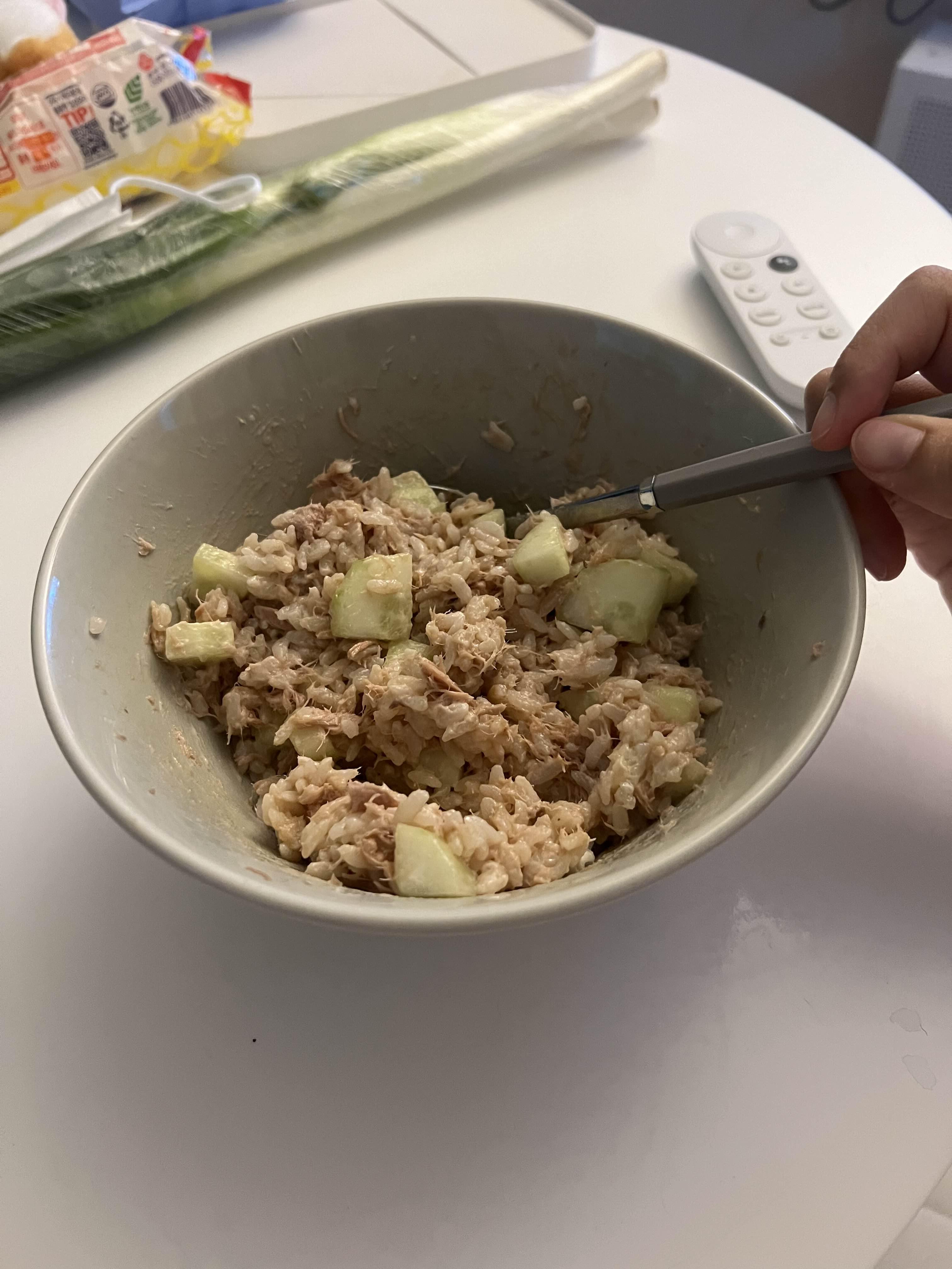 참치는 숟가락 꾹 눌러 기름 빼주시고, 오이는 반개 먹기좋게 잘라주세요