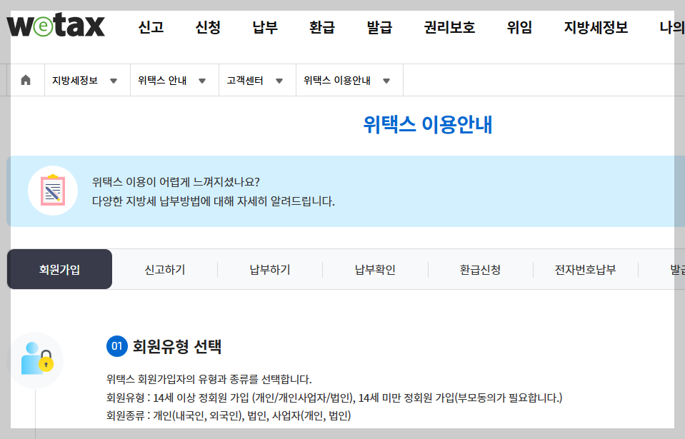 아래 이미지를 클릭하시면 위택스 이용 안내 사이트로 연결됩니다.