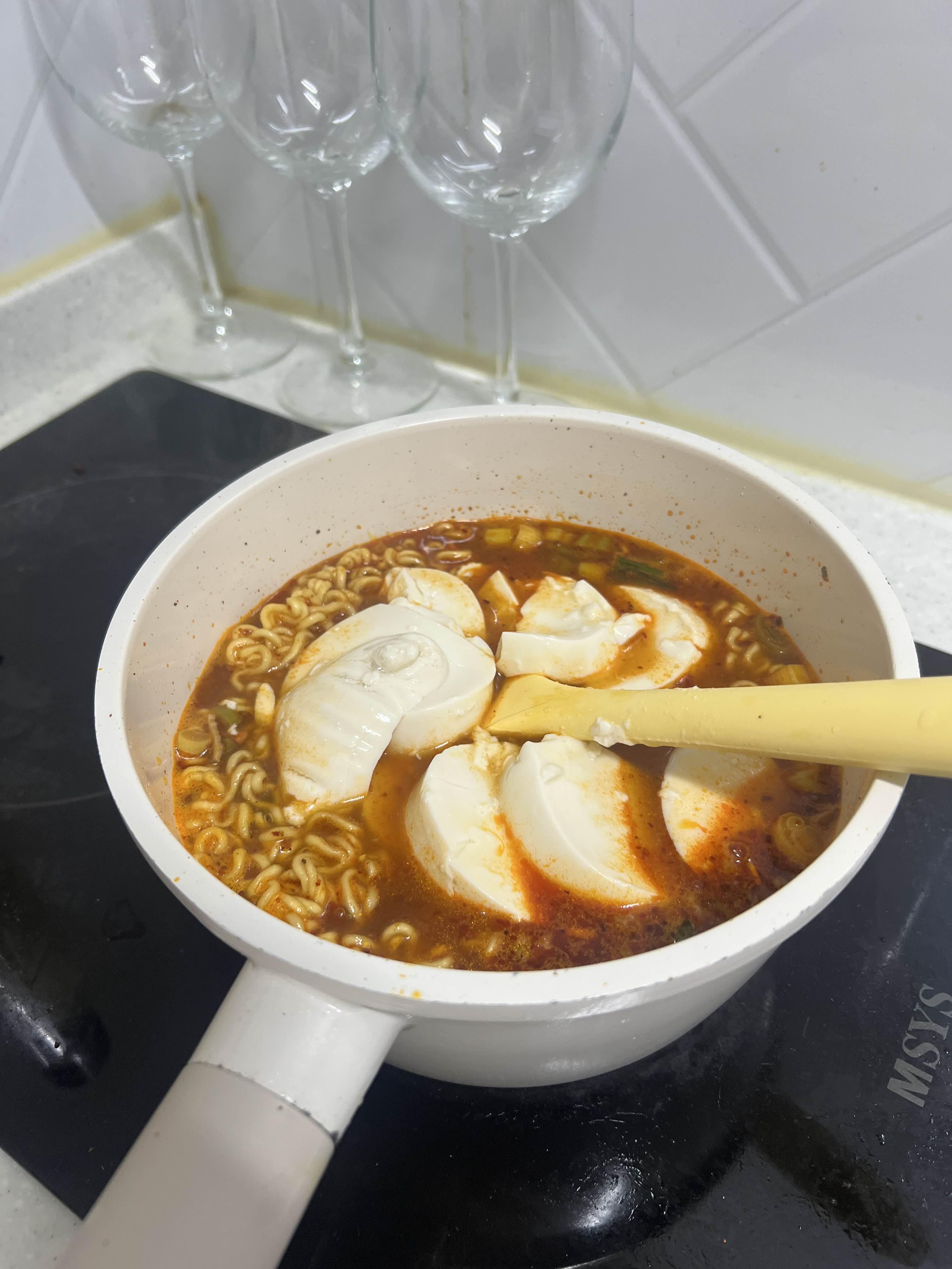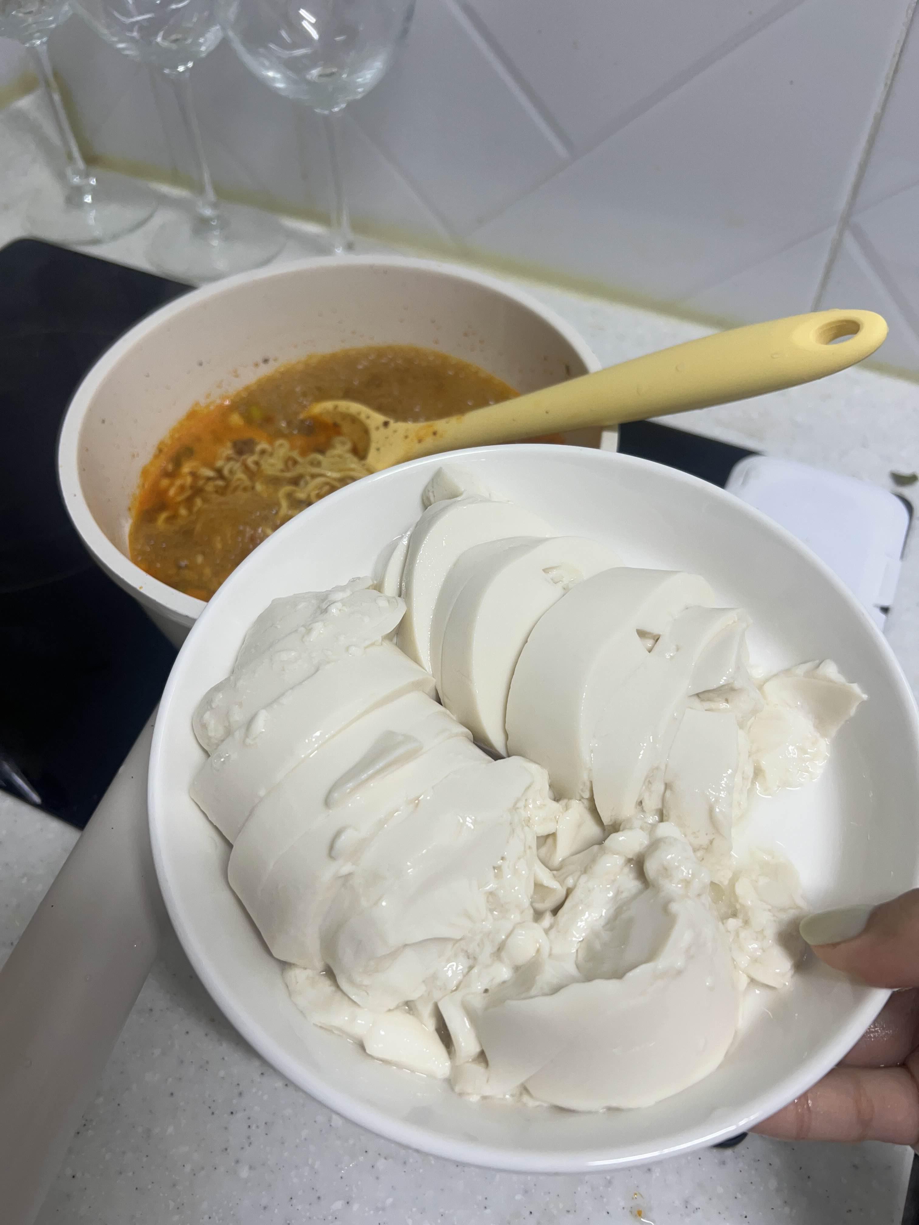순두부 썰어주고 라면이 절반정도 익으면 순두부를 투하해줍니다.