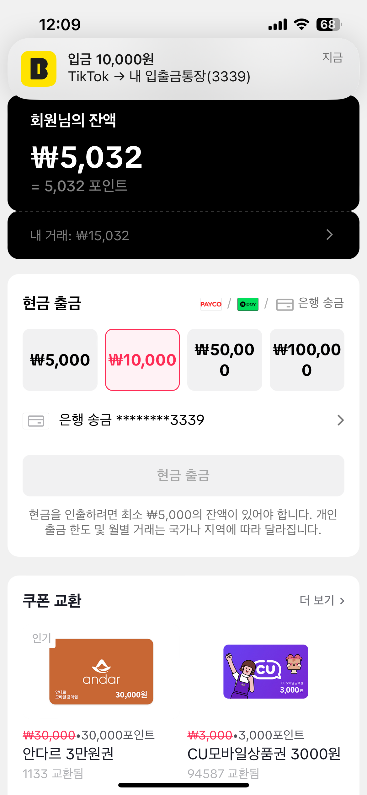 현금 출금 버튼이 있어서 한번 해봤어요.
